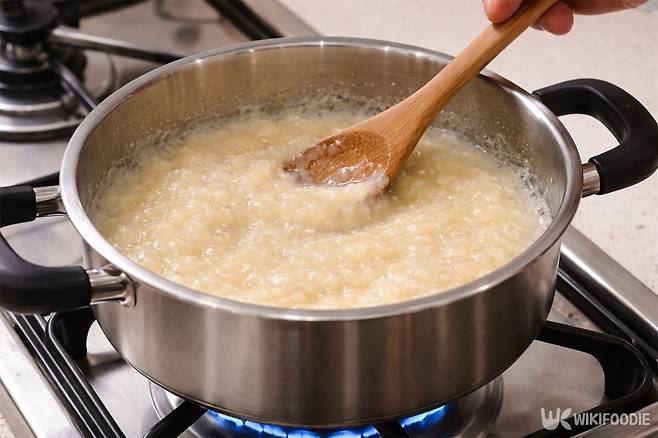 간 감자를 냄비에 붓고 중간 불에서 천천히 저어가며 끓이다 보면 점차 끈적한 점성이 생긴다.