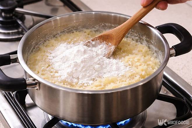 반죽이 걸쭉해졌을 때 불을 끄고 타피오카 전분 3큰술을 넣어 빠르게 섞어주면 쫀득한 식감이 살아난다.