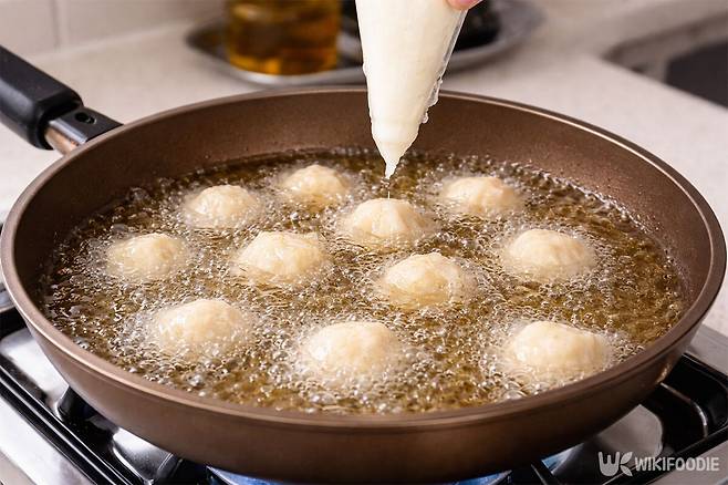 완성된 반죽은 짤주머니에 담아 준비한다. 팬에 식용유를 넉넉히 두르고 반죽을 길게 짜면서 적당한 길이로 잘라 넣는다. 처음에는 중간 불에서 튀기기 시작해 속까지 익도록 불을 낮추어 노릇하게 색을 낸다.