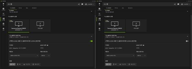 게임을 하는 유저라면 당연 NVIDIA G-SYNC와 AMD FreeSync Premium Pro를 빼놓을 수 없는 기능입니다. 빠른 응답속도와 주사율로 두가지 기능이 크게 느끼기 힘들지만 UHD 60hz로 찰영한 영상을 프레임별로 끈어서 동작을 살펴보면 약간의 차이를 느낄 수 있습니다. 제가 사용하는 그래픽카드는 엔디비아이기에 G-SYNC기능을 선택할 수 있습니다.