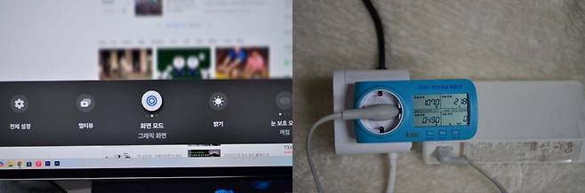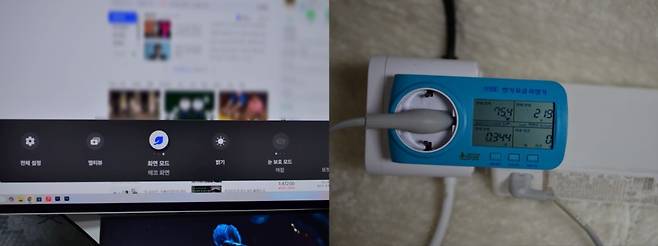 동일한 환경에서 에코화면으로 전환하면 74~76W의 소비전력을 보여주는데 화면 밝기가 낮아지면서 전력소비도 낮아지는 것을 보여주었습니다. 에코모드는 밝고 쨍한 사무실에서도 그래픽이나 영상작업을 하는데 크게 문제는 안되지만 색상의 차이를 느낄 수 있으나, 일반적인 웹서핑이나 스마트 티비를 볼때는 에코모드로 시청해도 큰문제가 되지는 않았습니다.
