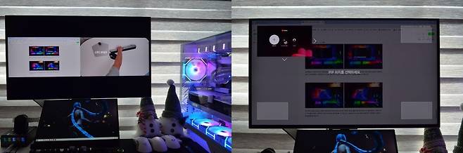 티비나 OTT 앱, 스마트폰 미러링, PC 모니터 화면 중 원하는 화면을 2개 뛰워놓고 사용하는 멀티뷰 기능은 이번 체험하면서 제일 많이 사용했던 기능인 것 같습니다. 2분활, 4분활로 선택하여 멀티뷰창을 설정할 수 있습니다. 2분활은 21:9화면비로 줄어들어 다소 불편할 수 있으나 4분활 중 원하는 위치에 배치하여 사용하면 편리하게 이용이 가능합니다. 저는 멀티 뷰를 이용하여 OTT를 시청하거나 멜론음악을 들으며 게임/ 블로그를 작성하니 상당히 편리했습니다.