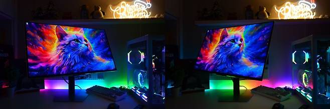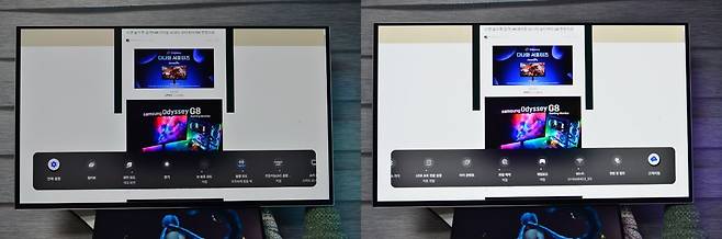 오디세이 G8의 OLED는 경쟁사 대비 진한 색감과 99% 원본에 가까운 색감은 물론 광시야각(좌우178˚)을 제공하고 있어, 어느 각도에서 보아도 뚜렷하고 원근 외곡없는 화면을 볼수가 있습니다. 250cd/㎡으로 낮은 점은 아쉽지만 가정에서 사용하기에 충분한 밝기입니다.