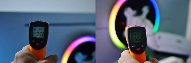 G8의 온도를 제어하는 세계 최초의 진동형 히트 파이프에서 배출되는 온도를 측정해 보았습니다. 게임부터 OTT 시청등 5시간 정도 사용 중 히트 파이프에서 자연 방열한 온도를 측정하니 33˚로 였으며, 보드가 장착된 중앙면은 56.3˚를 측정되었습니다. 4K의 고해상도에서 발생하는 고열을 다이나믹 쿨링 시스템으로 효과적인 열을 분산시켜 배출하는 것을 알수 있었습니다. 4K OLED의 밝기로 인해 발생하는 열을 효과적으로 제어하면서도 번인현상이 생기는 것을 제어하는 삼성 OLED 세이프가드+는 오랫동안 OLED를 사용할 수 있게해주는 AI기능을 탑재하는 등 삼성전자의 모니터 기술은 대다수의 경쟁사를 넘사벽으로 만드는 기술을 보여줍니다.