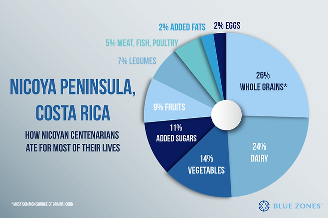 코스타리카 사람들은 하루하루를 행복하게 살고자 하는 열망이 강한데, 그들이 생각하는 행복한 삶의 조건으로는 ‘가족 간의 강한 유대 관계’ ‘매일매일의 목적의식’ ‘잘 먹는 것’ 등이 있다. 블루 존은 ‘낮은 열량의 식사를 하는 것이 수명을 연장하는 가장 확실한 방법 중 하나’라고 분석한다. 니코야 사람들은 이른 저녁에 가벼운 저녁을 먹는다. 100세가 넘은 사람들의 식습관을 조사했더니 평생 ‘호박, 옥수수, 콩’을 주로 먹는 전통적인 메소아메리카(Mesoamerica: 멕시코와 중미 지역 문화권) 식단을 유지한 것으로 나타났다.