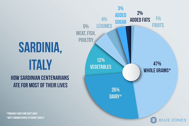 유전적 요인만큼 후천적인 부분도 중요하다. 사르데냐 사람들은 지리적으로나 문화적으로도 고립된 채 오랜 시간을 보냈다. 전통적이고 건강한 생활 방식을 지금도 유지하고 있다. 사르데냐 사람들은 매우 활동적이고 낚시와 농사를 직접 지으며 살아간다. 현지에서 수확한 식재료로 건강한 음식을 만들어 먹는다. 지역 사회 결속력도 중요하다. 사르데냐에서는 마을 사람들이 모여 함께 웃고 떠들며 식사를 하는 풍경을 흔히 볼 수 있다. 블루 존에서 분석한 사르데냐 사람들의 장수 비결은 ‘가족 우선주의’ ‘산책하기’ ‘노인 공경’ ‘하루 한두잔 레드 와인 마시기’ ‘친구와 함께 웃기’ ‘산양유 마시기’ 등이 있다.
