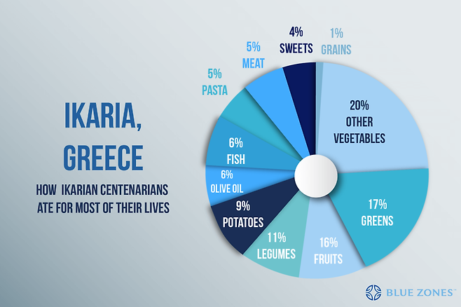 면적 261㎢의 이카리아섬은 동서 길이 약 40㎞로 바위가 많은 지형이다. 인구는 1만 명이 채 안 된다. 놀랍게도 이 섬마을에선 치매나 만성 질환을 거의 찾아볼 수 없다. 게다가 이곳 주민 3명 중 1명은 90대까지 산다. 블루 존이 분석한 이카리아 장수의 비결은 ‘공동체 중심의 문화 활동’ ‘식단’ ‘훌륭한 와인 한잔’ 등이다. 깨끗한 공기와 따뜻한 바람 등 기후 조건과 자연환경이 훌륭하다. 거친 지형의 섬 이곳저곳을 다니면서 자연스럽게 운동도 된다. 이웃들과 모여 밤 늦게까지 와인을 마시며 게임을 즐기는 여유로운 삶도 이카리아 사람들이 건강하게 오래 살 수 있는 비결로 꼽혔다.