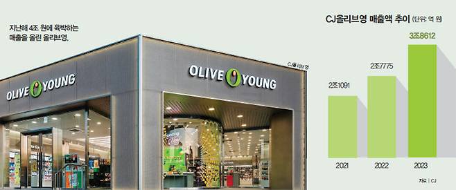 CJ올리브영(올리브영)이 무서운 성장세로 국내 뷰티시장 판도를 바꾸고 있다. CJ가 3월 20일 공개한 사업보고서에 따르면 2023년 올리브영 매출액은 3조8612억 원으로, 전년 2조7775억 원보다 40% 가까이 성장했다(그래프 참조). 이는 지난해 25조1411억 원으로 추산되는 전체 뷰티시장의 15%에 이르는 규모다. 시장을 미용·건강용품 시장 개념인 H&B(헬스 앤드 뷰티)로 좁히면 올리브영 시장점유율은 90% 이상이나 된다.