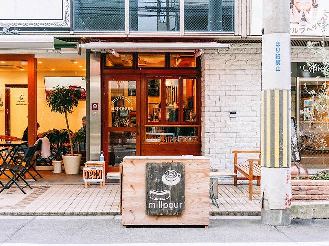 릴로커피 깃사에서 멀지 않은 곳에 밀푸어 커피가 있다. 릴로커피 깃사는 그래도 상업지구에 가깝고, 밀푸어는 난바의 핵심에서 조금 떨어진 조용한 로컬카페이다. 일본의 부동산 임대료가 비싸서인지, 밀푸어 커피를 포함한 오사카 난바의 커피 매장들은 스탠딩 커피바들이 많다.