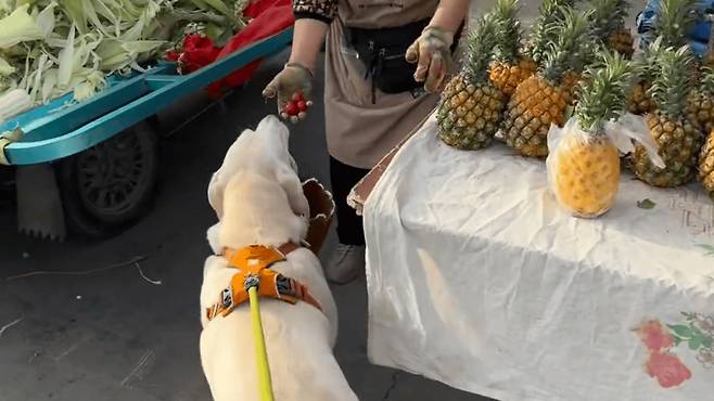 다른 과일 가게에서는 사장님께서 귀여운 강아지에게 방울토마토 몇 개를 건네주셨고, 강아지는 부끄럽지 않게 받아 물고는 신나게 뛰어갔습니다. 덕분에 주인은 또 파인애플을 구매했습니다.
