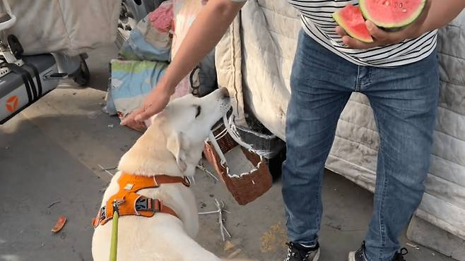 수박 가게 앞에서는 더욱 대담한 행동을 보였습니다! 직접 가게 주인에게 다가가 머리를 들이밀며 쓰다듬어 달라고 요구했습니다. 가게 주인은 강아지의 당돌함에 웃음을 터뜨렸을 것입니다.