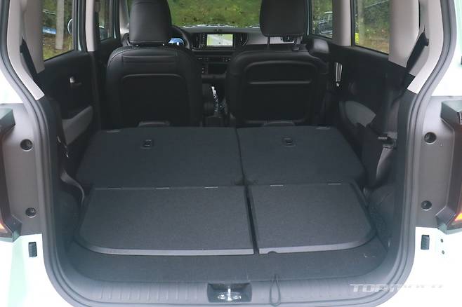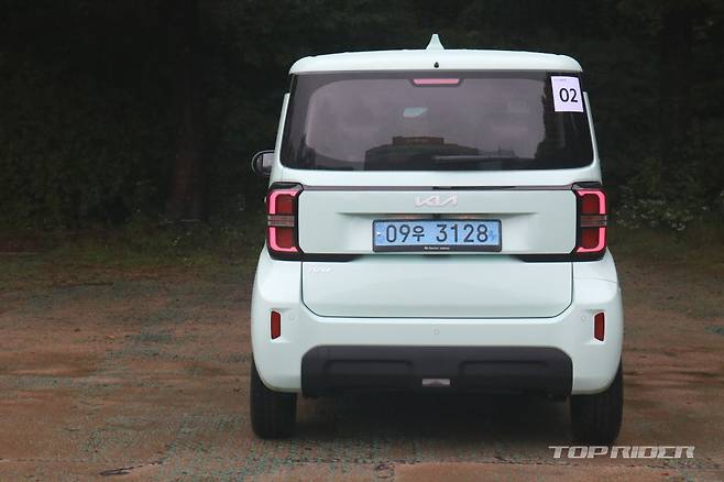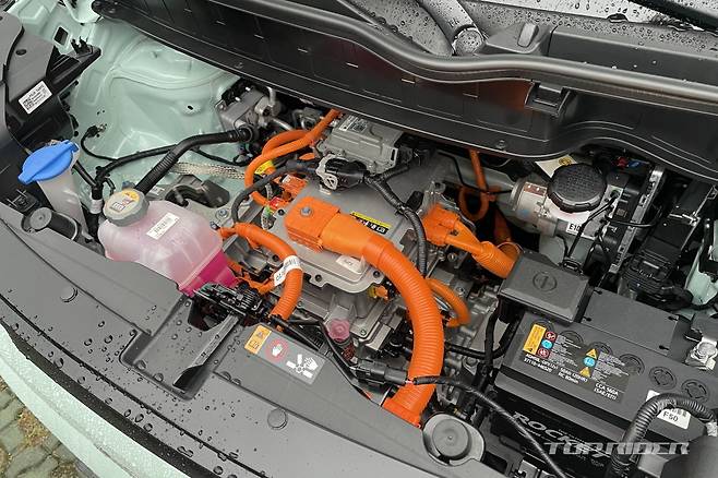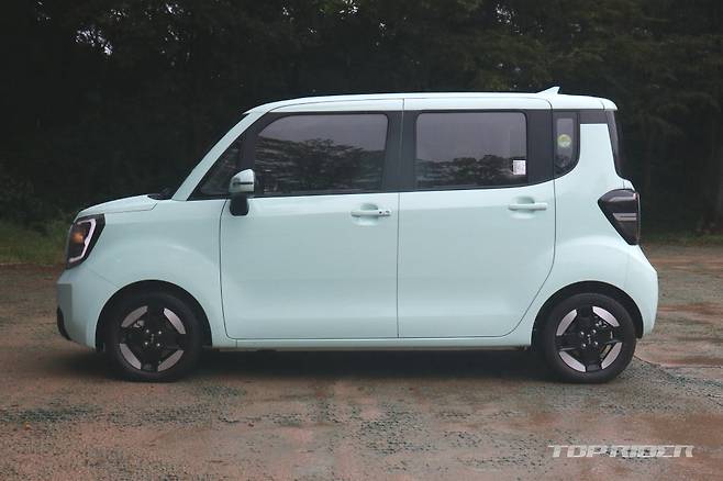 신형 레이 EV 외관은 레이 내연기관과 차이가 없다. 14인치 전용 휠이 탑재된 것과 전면부에 배치된 충전구 정도가 다르다. 조수석쪽 2열 도어만 슬라이딩 방식이다. 신형 레이 EV는 전면부 트렁크 공간이 없다. 대신 PE룸(내연기관 엔진룸)이 있는데, 별다른 커버는 없다.