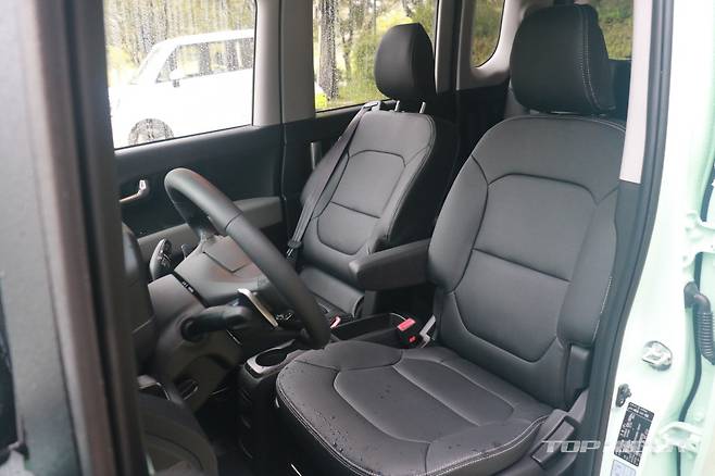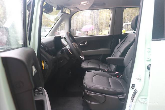 실내에는 오토 홀드가 포함된 전자식주차브레이크(EPB), 10.25인치 디지털 계기판, 컬럼 타입 전자식 변속레버 등 레이 내연기관과 차별화된 사양이 적용됐다. 스티어링 휠에는 회생 제동 단계를 조절할 수 있는 패들 시프트가 탑재됐다. 신형 레이 EV 시트 포지션은 높다.