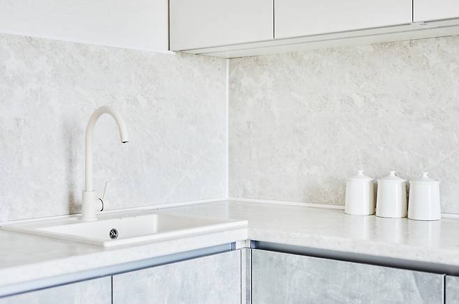 우리나라에서 가장 대중적으로 사용되는 상판입니다. 가공이 쉬워 맞춤형 제작이 용이하고 가격이 합리적이라는 장점이 있습니다. 하지만 열에 민감하여 뜨거운 냄비나 조리 기구를 직접 올려놓으면 변형이 생길 수 있어요.