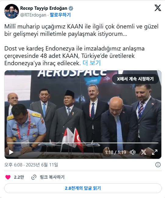 레제프 타이이프 에르도안 튀르키예 대통령은 "체결한 협정의 틀 안에서 KAAN 48대가 인도네시아에 수출될 예정"이라고 직접 발표했습니다.