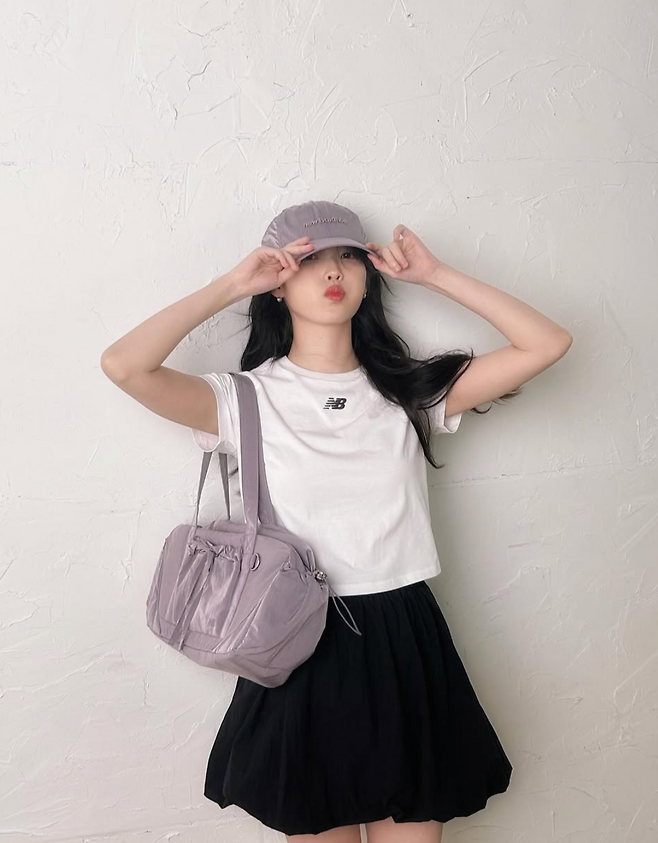 두번째 사진에서는 화이트 크롭 티셔츠와 블랙스커트, 여기에 연보라색 캡과 가방을 매치한 스타일링입니다. 활동성도 챙기면서 색 조합은 통일성 있게, 아이유 특유의 꾸안꾸 귀여움이 가득한 데일리룩입니다. 입술 쭉 내민 표정마저도 스타일의 일부처럼 보이는 센스가 돋보입니다.