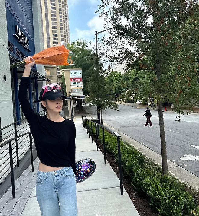 세번째 사진에서 아이유는 심플한 블랙 티셔츠에 연청 와이드 데님 팬츠를 매치한 코디를 보여줬습니다. 허리라인이 살짝 드러나는 크롭 기장이지만 전혀 과하지 않고 자연스러운 무드를 더해줍니다. 여기에 모자, 선글라스, 꽃다발 등 소품을 활용해 자유로운 도시 분위기를 완성한 룩입니다.