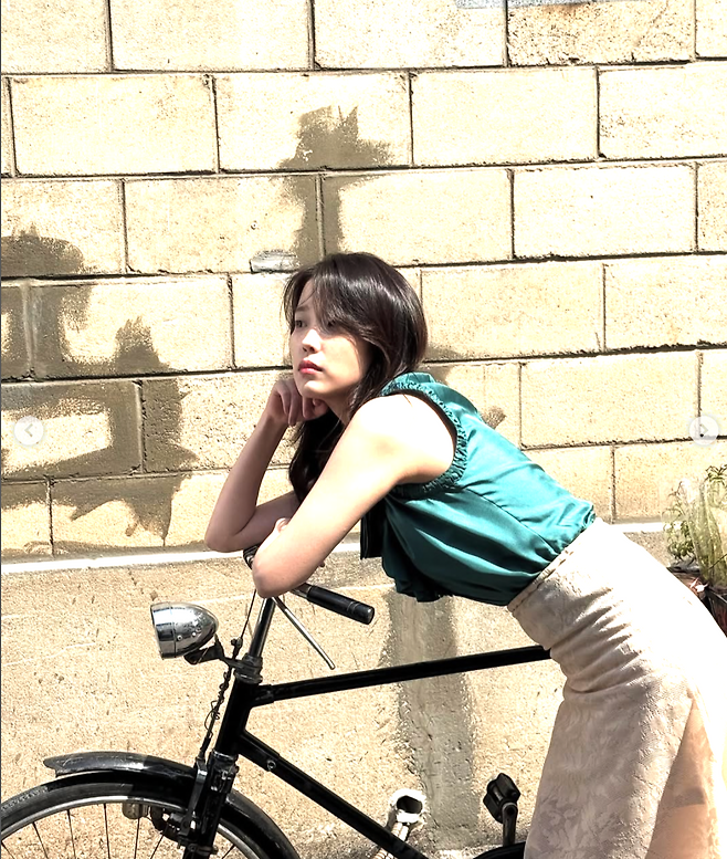 첫번째 사진 속 아이유는 벽돌담 앞 자전거에 기대서 에메랄드빛 민소매 톱과 연한 크림 플로럴 롱스커트 조합의 빈티지하면서도 우아한 데이트룩을 연출했습니다. 햇살에 비친 실루엣까지 그림같고, 군더더기 없는 착장인데도 도시 감성과 여름의 몽환적인 느낌을 자아냅니다.
