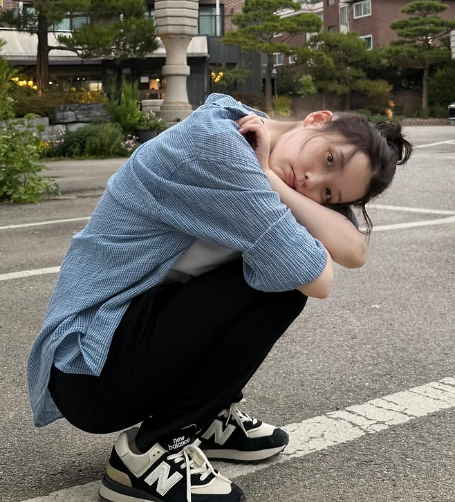 네번째 사진에서는 헐렁한 체크 셔츠에 조거팬츠, 그리고 뉴발란스 운동화, 모든게 편안하고 평범해보이지만 그 안에 아이유만의 단정함과 캐주얼한 무드가 살아있다. 쭈그려 앉은 포즈조차 화보 같고, 민낯같은 메이크업으로 특유의 청순한까지 느껴지는 스타일링입니다.