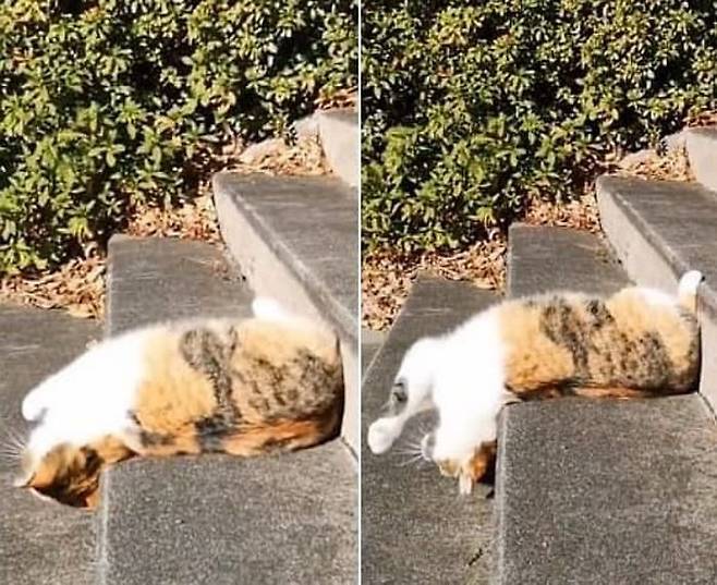 '고양이 액체설'이라는 말이 무색하지 않을 정도로 흐물흐물하다시피 계단을 내려가는 고양이 모습을 보니 웃음만 나옵니다.