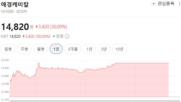 주가는 장 초반부터 강세를 보이더니 오후 들어 가격제한폭인 14,820원까지 치솟았다.