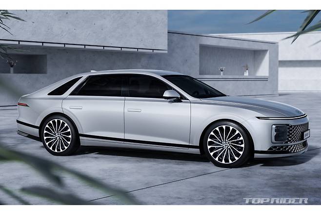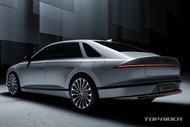 C필러 오페라 글래스는 1세대 그랜저의 향수를 떠올리게 한다. 최대 20인치 휠이 제공된다. 후면부는 전면부와 마찬가지로 수평하게 이어지는 테일램프가 탑재됐다. 실내는 탑승자를 편안하게 감싸는 랩어라운드 구조로 과거 80년대 그랜저의 유산을 현대적 감각으로 계승했다.