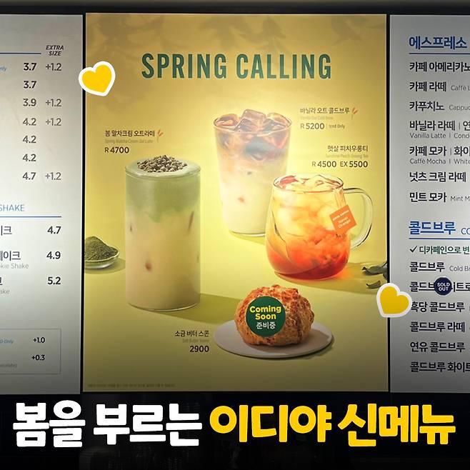 멀리서 봐도 봄봄한 느낌에 저도 몰래 시선을 빼앗겼는데 역시나 봄 신상 메뉴더라구요! 포근한 날씨, 따뜻한 햇살을 연상 시키는 신상의 등장에 저도 모르게 이디야로 입장!