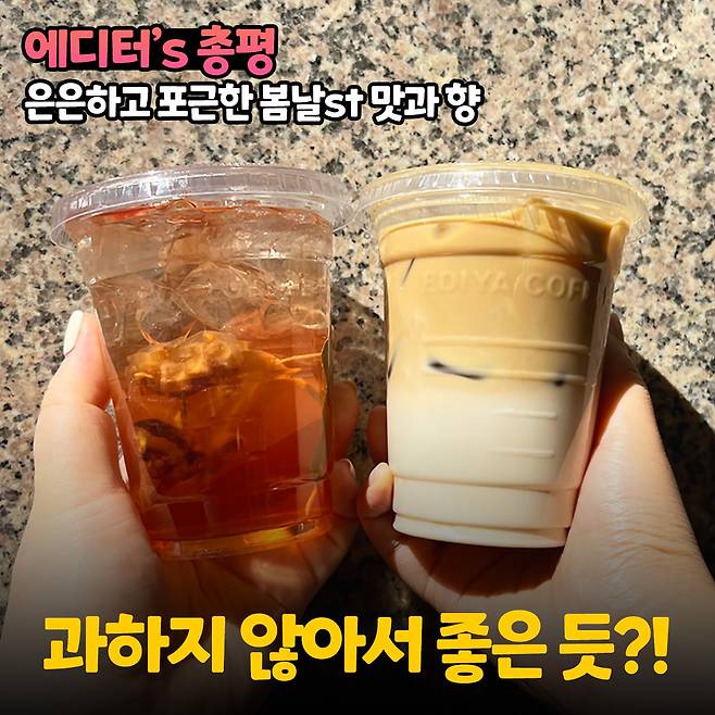이번 이디야커피 신메뉴 2종은 은은하고 포근한 비주얼과 맛, 향을 지닌 것 같아요. 전체적으로 과한 부분이 없어서 부담없이 자주 사먹으러 갈 예정이랍니다!