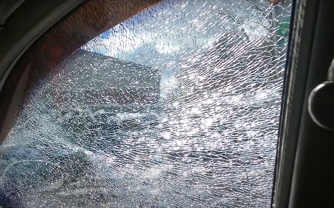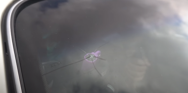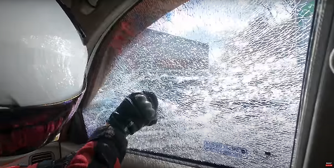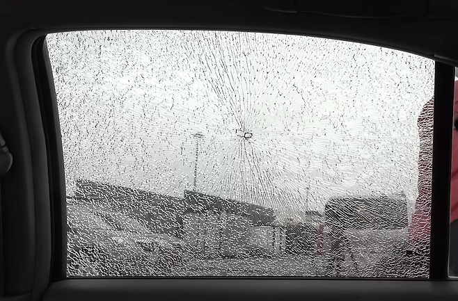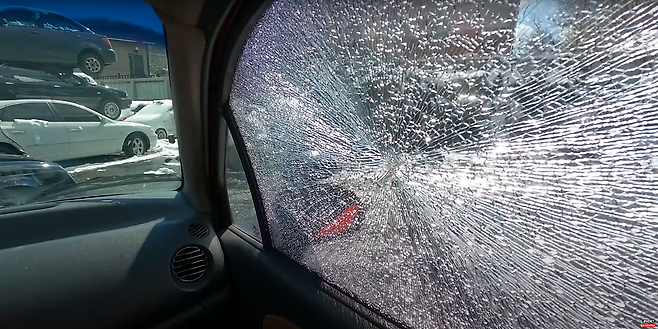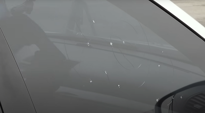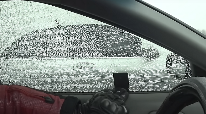 다 똑같은 유리로 보이지만 전면유리와 사이드유리는 다르다는걸 볼 수 있었는데, 전면유리를 강화유리를 사용한게 아닌 이중접합유리를 사용한데에는 이유가 있습니다. 강화유리는 충격을 받자마자 산산조각이 나게 되며 시야가 방해되는 모습을 볼 수 있으나 이중접합유리는 상처는 나지만 시야는 확보가 되는 모습을 볼 수 있습니다. 즉, 강화유리를 사용하는 상태에서 파손이 되는 경우 시야 방해의 우려가 있기 때문에 강화유리가 아닌 이중접합유리를 사용한다고 볼 수 있겠습니다.