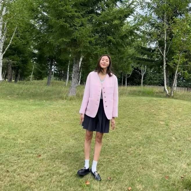 세 번째는 핑크 트위드 재킷에 네이비 플리츠 스커트 스타일이다. 재킷은 엉덩이를 덮는 길이로, 크롭 기장보다 훨씬 편하게 입을 수 있다. 스커트는 짧고 주름이 촘촘하게 잡혀 있다. 걸을 때마다 주름이 퍼져 시선이 아래로 이어진다.
