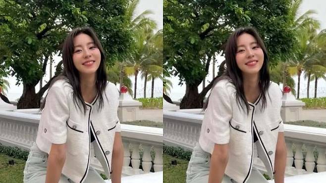 핑크 트위드 재킷으로 표현한 따뜻한 계절감