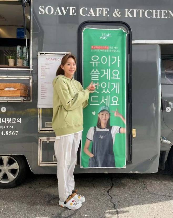 첫 번째는 민트색 후드티에 흰색 조거 팬츠 패션으로, 편안하면서도 깔끔해 보이는 무드가 특히 눈길을 끈다. 유이가 입은 후드티는 세인트제임스의 ‘봉봉 후디’로 알려져 있다.