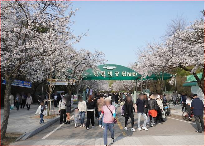 남문을 통과해 공원 안쪽으로 발을 들이면, 자동차가 통제된 광활한 벚꽃길이 펼쳐집니다. 발걸음을 옮길 때마다 코끝을 스치는 맑은 공기와 은은한 꽃향기는 도시의 소음을 잊게 만듭니다. 아직은 개화율이 50% 이상인 상태임에도 불구하고, 고개를 들어 하늘을 바라보면 팝콘처럼 피어난 꽃송이들이 파란 하늘과 대비를 이루며 시각적인 황홀경을 선사합니다.