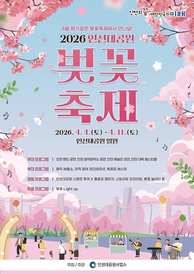 인천대공원사업소는 벚꽃 개화기에 맞춰 더욱 풍성해진 '2026 인천대공원 벚꽃축제'를 개최합니다. 기존의 이틀간 열렸던 행사를 대폭 확대하여 8일간 이어지는 이번 축제는 '벚꽃맞이 주간'으로 운영되어 시민들에게 넉넉한 휴식을 제공합니다.