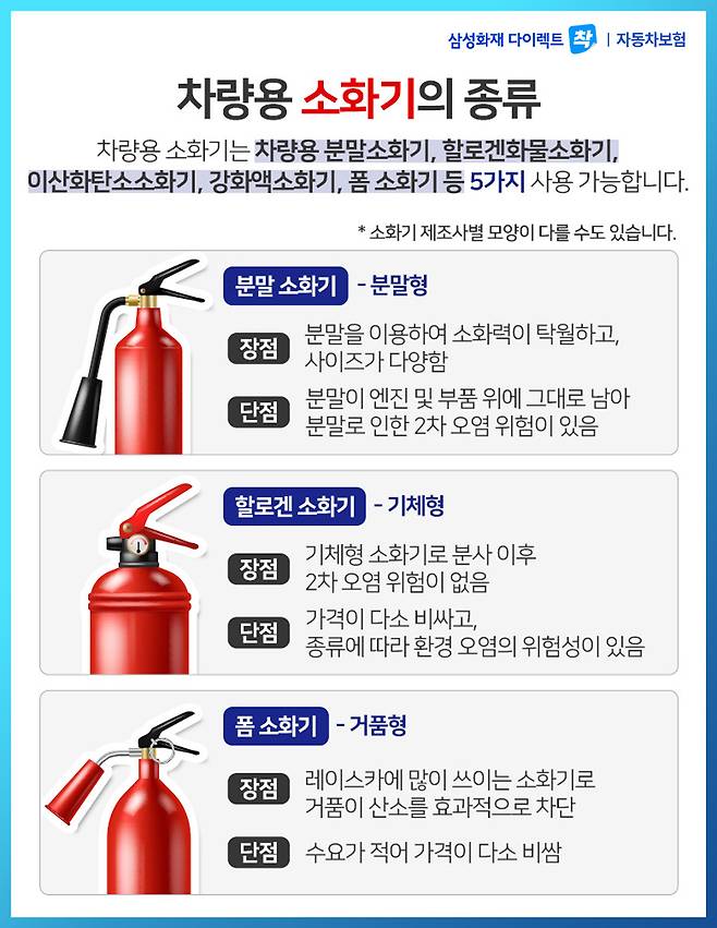 자칫 잘못하면 많은 인명피해와 손해를 볼 수 있는 자동차 화재사고! 이런 화재사고를 대비하기 위해 차량용 소화기가 필요한데요. 내 차에 어떤 차량용 소화기가 필요한지 함께 확인하시죠.