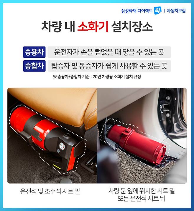 소화기를 샀다고 하더라도, 어디에 설치를 하면 좋을지 고민이 많으실 텐데요. 우선 2020년 차량용 소화기 설치 규정을 살펴보면
