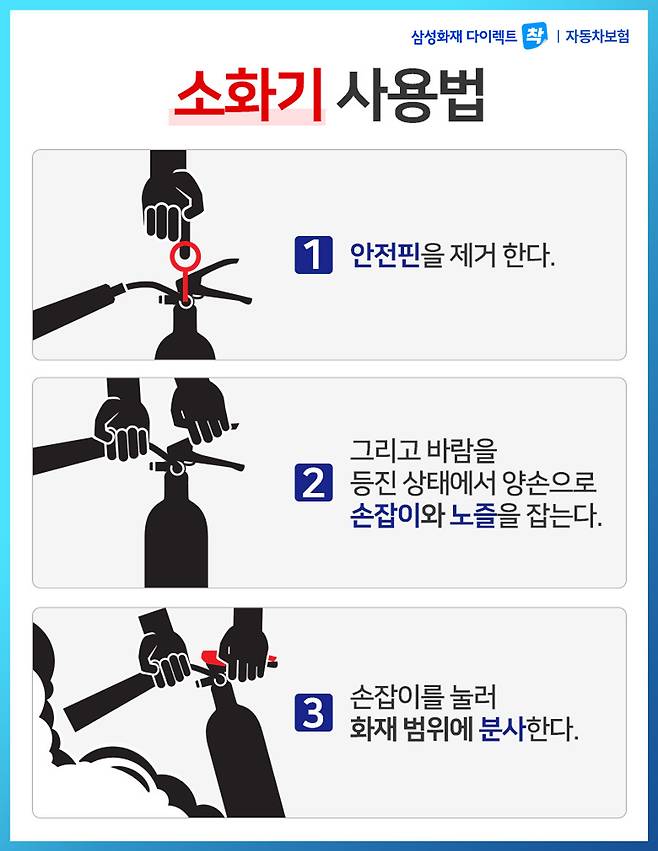 차량용 소화기도 일반 소화기처럼 관계없이 안전핀을 뽑고, 화재가 난 곳을 향해 노즐을 잡고 분사하면 됩니다.