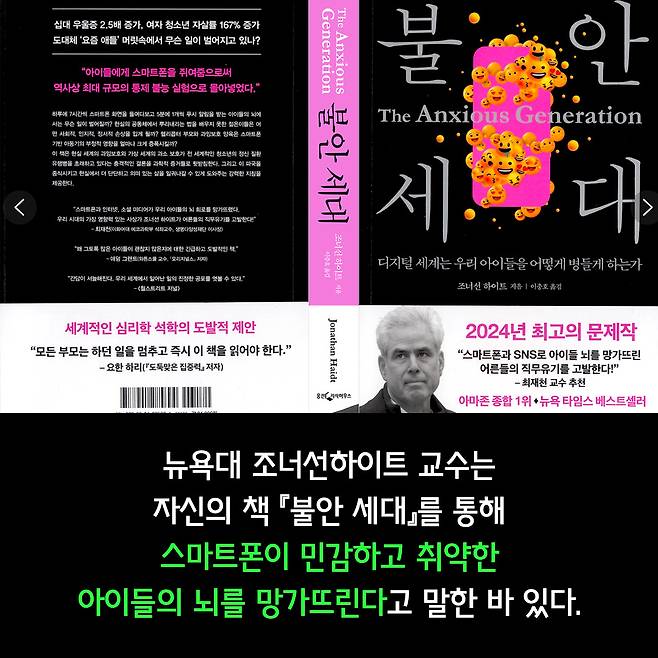 뉴욕대 조너선 하이트 교수 역시 스마트폰은 민감하고 취약한아이들의 뇌를 망가뜨린다고 자신의 책 『불안 세대』를 통해 밝힌 바 있습니다.