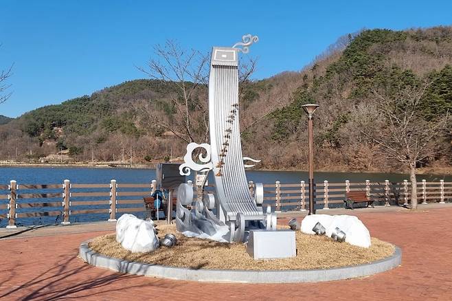 중화저수지 산책의 시작점은 수면 위를 가로지르는 데크 로드 가얏교입니다. 다리 입구에는 가야금 조형물이 세워져 있어, 대가야의 도읍지이자 악성 우륵의 고장인 고령의 정체성을 한눈에 보여줍니다.