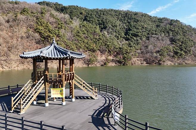 다리 위로 발걸음을 옮기면 물 위를 걷는 듯한 개방감이 전해지고, 잔잔한 수면과 주변 산자락이 어우러져 자연스럽게 걸음이 느려집니다.