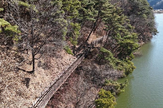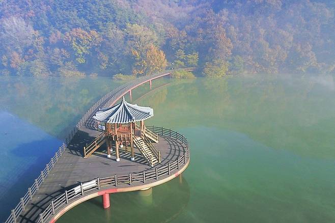 다리 위로 발걸음을 옮기면 물 위를 걷는 듯한 개방감이 전해지고, 잔잔한 수면과 주변 산자락이 어우러져 자연스럽게 걸음이 느려집니다.