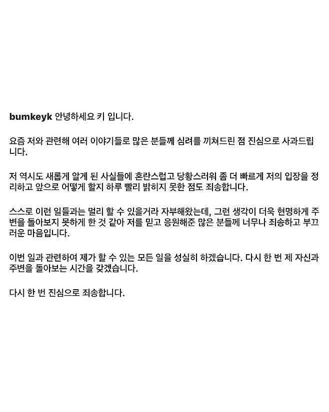 이에 따라 키는 사안의 엄중함을 고려해 “현재 예정돼 있던 일정과 출연 중이던 모든 프로그램에서 하차하기로 결정했다”고 전했습니다. 소속사는 “팬 여러분과 대중께 심려를 끼쳐드린 점에 대해 진심으로 사과드린다”고 고개를 숙였습니다.