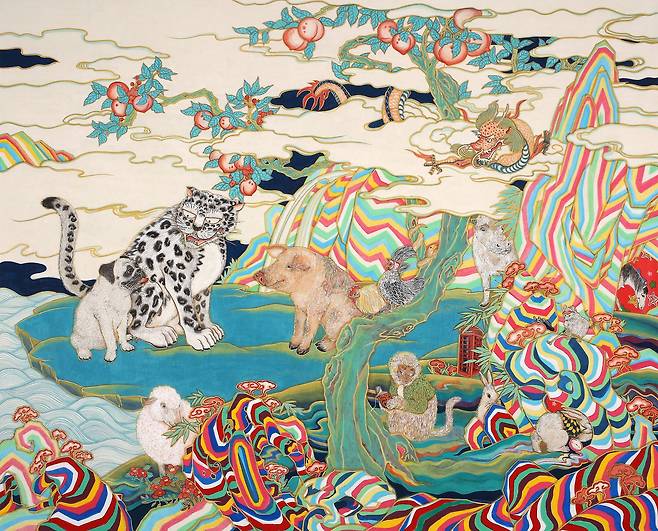 한국화 안에 민화적 상징 이미지를 차용하여 동물들과 같이 그리는 작업을 주로 하고 전통 채색 기법(진채)과 아크릴, 디지털 기법을 활용하여 그림을 표현합니다.
