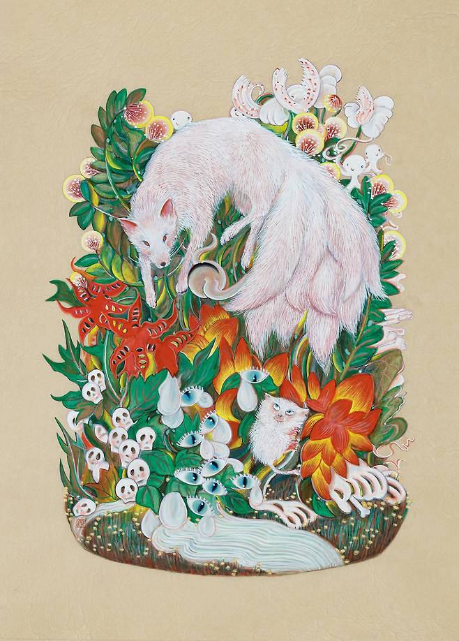 실제로는 없지만 인간과 오랫동안 반려하면서 존재하는 상상의 동물들은 우리나라 제주 신화와 작업이 연결되면서 서천 꽃밭을 배경으로 재해석되었습니다.