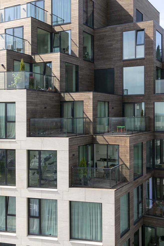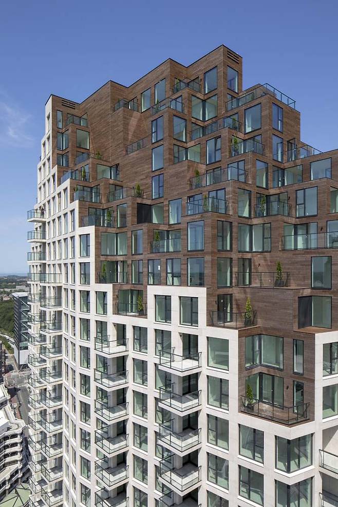 상위 10개 층에 외부에 적용된 짙은 밤색상의 대나무 복합재는 이 아파트 건물 디자인의 방점을 찍는다. 친환경 소재의 사용이라는 점과 아파트 외부에 목재를 사용했다는 점, 그리고 석재 색상과 극명하게 되는 점 등, 다방면에서 이 아파트의 완성도를 높여주었다.