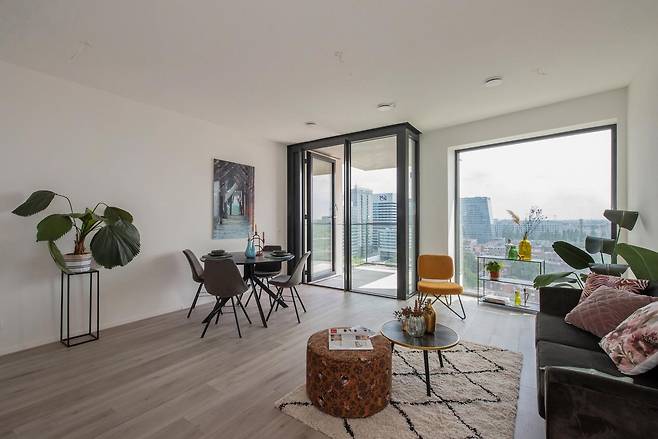 이런 자연스러움은 창틀이 바닥과 어떻게 연결되냐에서 오는 차이가 크다. Grotius Towers는 내부와 발코니 사이 바닥 창틀이 거의 같은 위치에 있다. 두껍고 튀어나온 틀을 넘어야 나가는 국내 아파트와는 다르다. 그리고 발코니가 내부까지 살짝 들어와 있다. Bay창의 위치와 비교했을 때 어느 정도까지 내부로 들어 왔는지 확인할 수 있다.