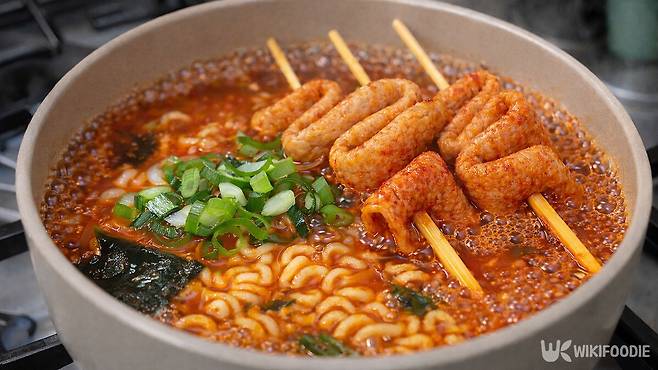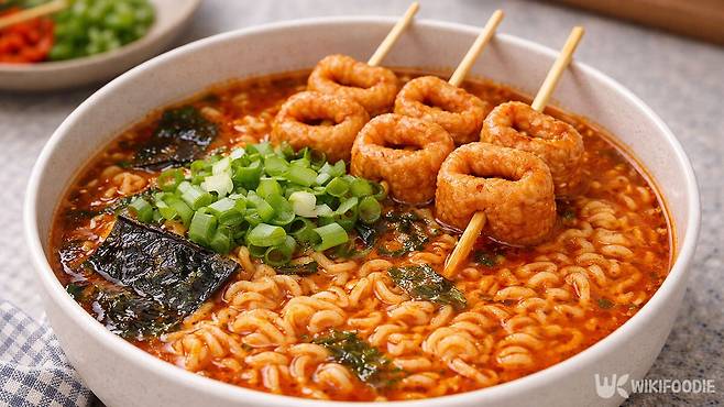 국물이 팔팔 끓기 시작하면 면을 먼저 넣는다. 1분 뒤 준비해 둔 어묵 꼬치를 넣고 총 5분간 더 끓인다. 4분 정도 지났을 때 면을 가볍게 풀어주면 골고루 익는다. 어묵에서 맛있는 성분이 빠져나오며 국물이 한층 묵직해진다.
