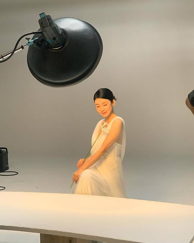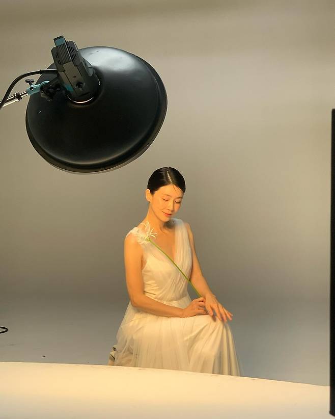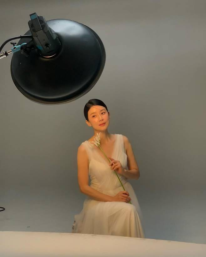 화이트 드레스에 투명한 튤이 겹겹이 감긴 이보영의 모습이 마치 한 송이 꽃처럼 고요하게 빛나고 있어요.