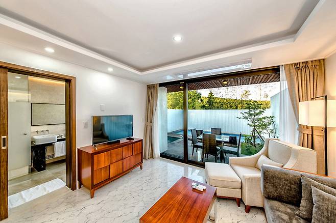 더쉼팡스파앤풀빌라는 제주 특유의 변덕스러운 날씨에도 견딜 수 있는 견고한 콘크리트 구조로 지어졌는데요. 제주 화산석과 스타코플렉스를 고급 마감재로 사용하여, 건물 자체가 자연과 어우러지는 느낌을 줍니다.