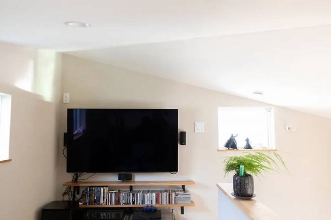 2층 거실의 위쪽에는 남편을 위한 작은 극장 용도의 로프트가 자리 잡고 있습니다. 공간을 효율적으로 활용하면서도 삶의 취향과 여유를 반영한, 소박한 취미 공간의 좋은 예시입니다. 다른 한편에는 계절용품을 보관할 수 있는 추가 수납 공간이 마련되어 있습니다.